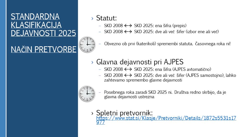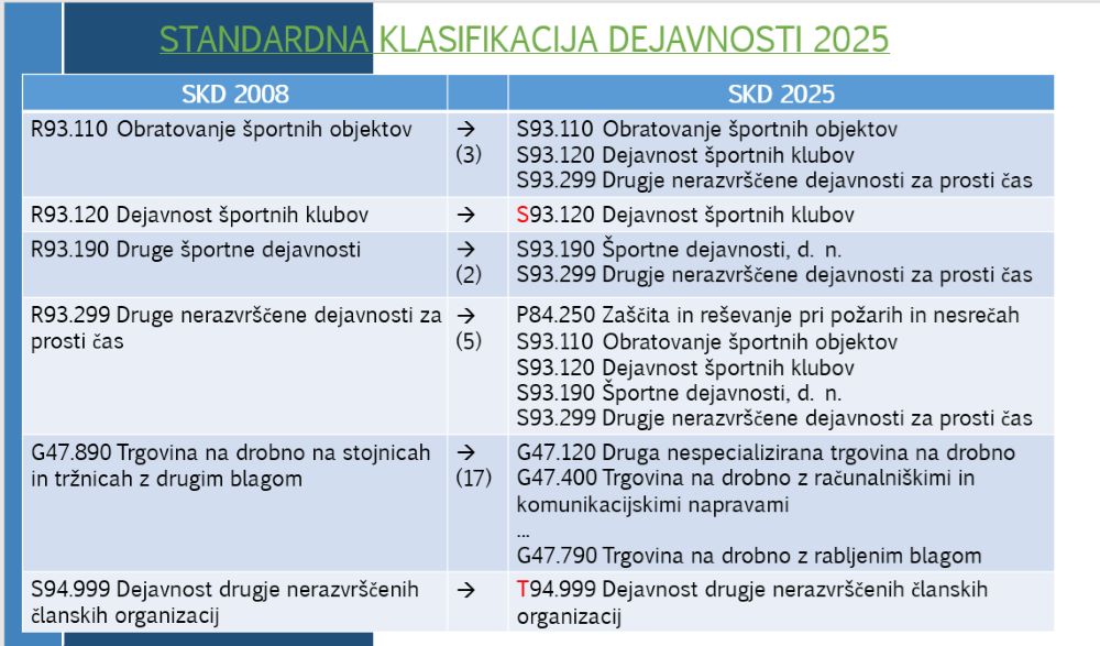 Društvo, ki ima statut sprejet pred 1. 1. 2025, mora ob vsaki spremembi statuta po tem datumu svoje morebitne pridobitne dejavnosti uskladiti z novo klasifikacijo dejavnosti 2025. Pomagate si lahko z orodjem za pretvorbo, tako da vpišete staro šifro in vam aplikacija izpiše, kako se ta šifra imenuje po novem. Če se je stara šifra razdelila na več novih, izberemo eno ali več novih šifer.